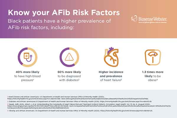 AFib is an irregular heart rhythm that can increase the risk of stroke and heart failure. Affecting more than 5.5 million people in the United States, AFib may cause symptoms including, but not limited to, palpitations, fatigue, shortness of breath and difficulty exercising. The Black population is at a higher risk of complications from AFib.